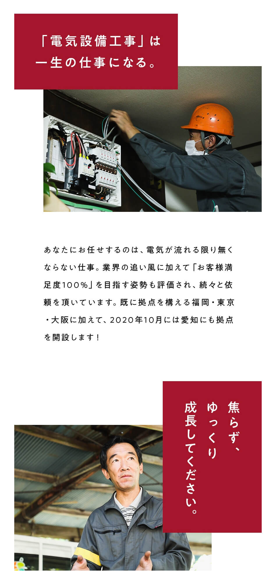 | 仕事内容 | ・一般電気工事 ・太陽光発電工事 ・店舗に伴う電気工事 ・LED交換工事 ・オール電化工事 ※エリア:九州一円 |